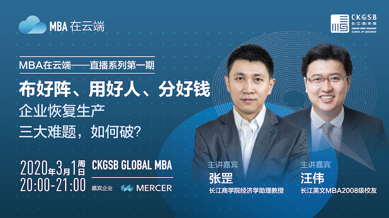 第一期云课堂,我们邀请到长江商学院经济学助理教授--张罡博士,美世咨询中国区资深合伙人、前麦肯锡咨询运营组织专家、MBA校友-汪伟先生分别从供应链角度理解新冠对中国经济中期的影响、支招企业供应链整合与资金盘活办法,以及如何迅速调整经营方式提高组织效能和将风险控制在最小程度。