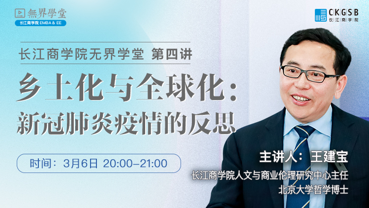 长江商学院EMBA&EE联合推出的“无界课堂”第四讲课程分享,由长江商学院人文与商业伦理研究中心主任、北京大学哲学博士王建宝老师,从乡土化和全球化的角度,带领大家共同挖掘自身的根源意识。