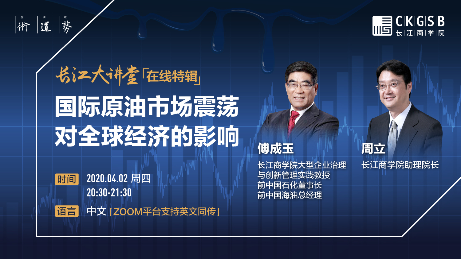 长江大讲堂线上特辑之“国际原油市场震荡对全球经济的影响”将于4月2日举办。特邀主讲嘉宾为长江商学院大型企业治理与创新管理实践教授、中国石化前董事长傅成玉先生。傅教授将就以下话题分享他的洞见,并将与长江商学院助理院长周立先生一道同在线观众展开对话: