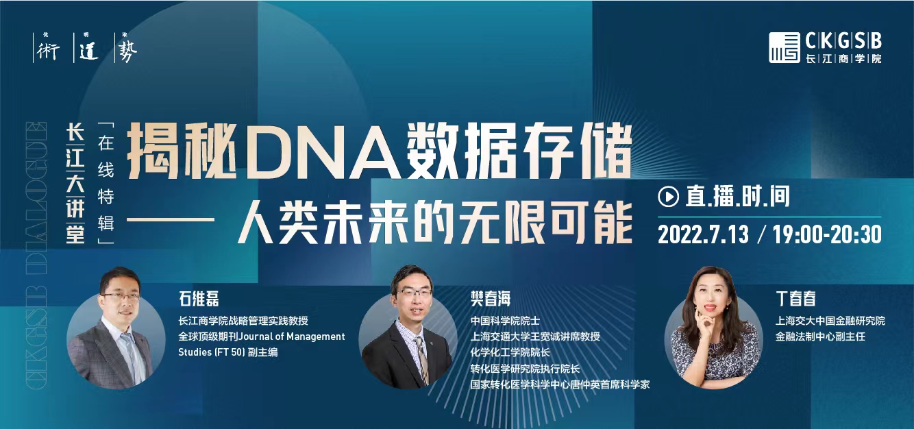 中国科学院樊春海院士,将以生动的案例回顾从DNA的生物学研究到DNA结构设计与制造研究,特别是通过解析DNA大数据存储的应用,展望信息技术和生物技术交融发展的未来。长江商学院战略管理实践教授石维磊教授、上海交大中国金融研究院金融法制中心副主任丁春春博士,将从技术转化、产业应用、投资前景、相关法律问题等企业家和投资人密切关注的方向,与樊院士展开深入的讨论。