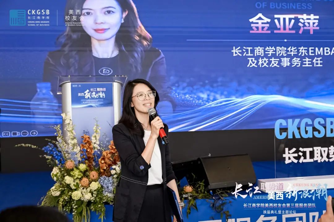 薪火相承,继往开来。长江商学院华东EMBA及校友事务主任金亚萍老师登台,介绍换届背景并宣读美西校友会第三届服务团队名单。