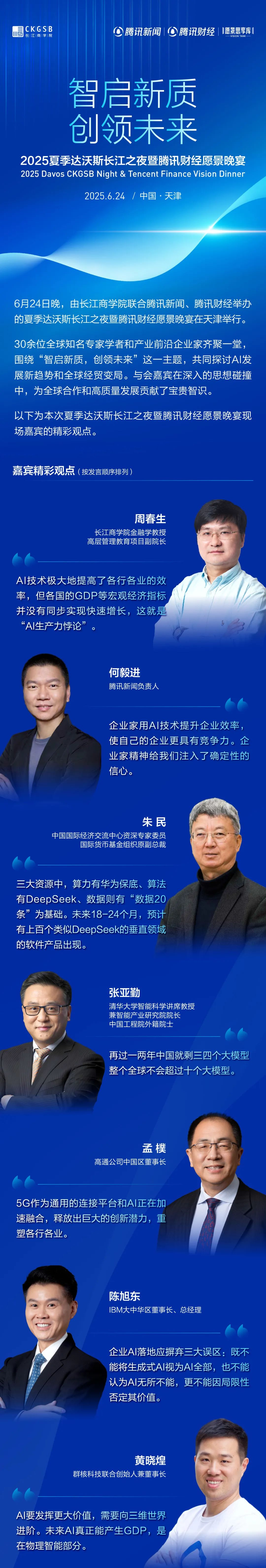 2025年6月24日,由长江商学院与腾讯新闻、腾讯财经在天津联合主办“2025夏季达沃斯长江之夜暨愿景晚宴”,为推动思想碰撞搭建了高端、国际的交流平台。数十位国际组织核心智囊、顶尖学府知名学者及科技企业决策者汇聚一堂,聚焦“智启新质,创领未来”这一主题展开巅峰对话,围绕如何在百年变局中重塑增长逻辑、在智能化浪潮中引领可持续发展释放前沿观点,探索共赢路径。