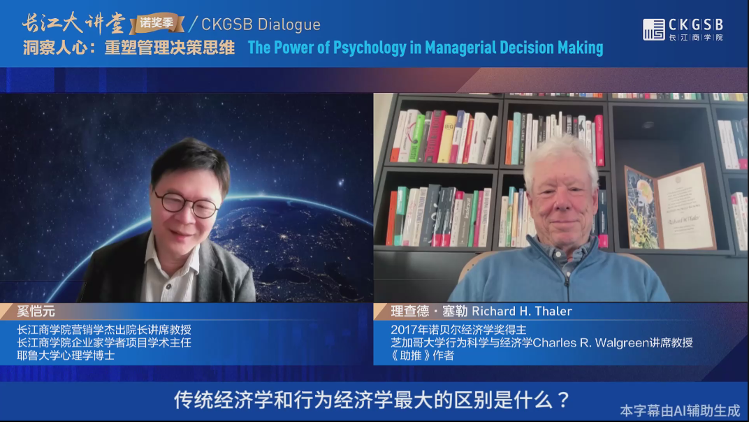 2025年2月20日,长江商学院营销学杰出院长讲席教授、企业家学者项目学术主任奚恺元,与2017年诺贝尔经济学奖得主、“行为经济学之父”、《助推》作者理查德·塞勒(Richard H. Thaler)以“洞察人心:重塑管理决策思维”为主题,展开了一场深刻而生动的越洋对话。