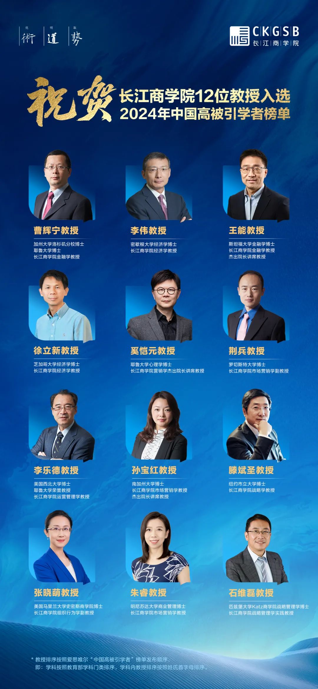 长江商学院12位教授入选2024“中国高被引学者”榜单