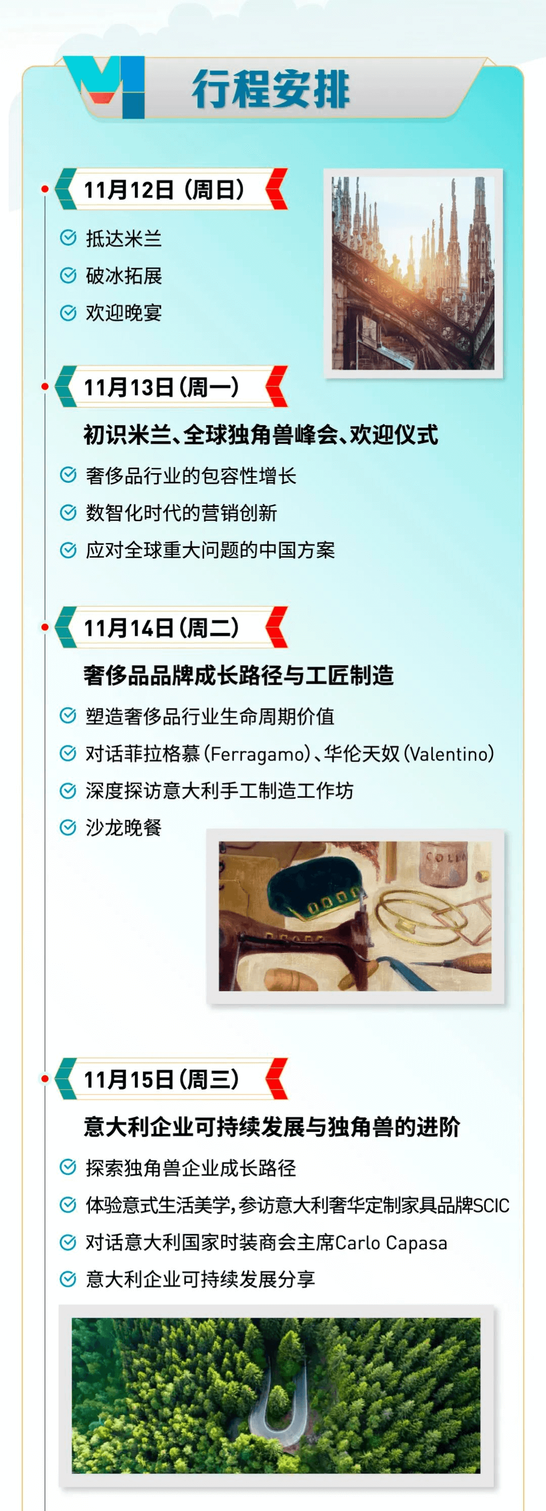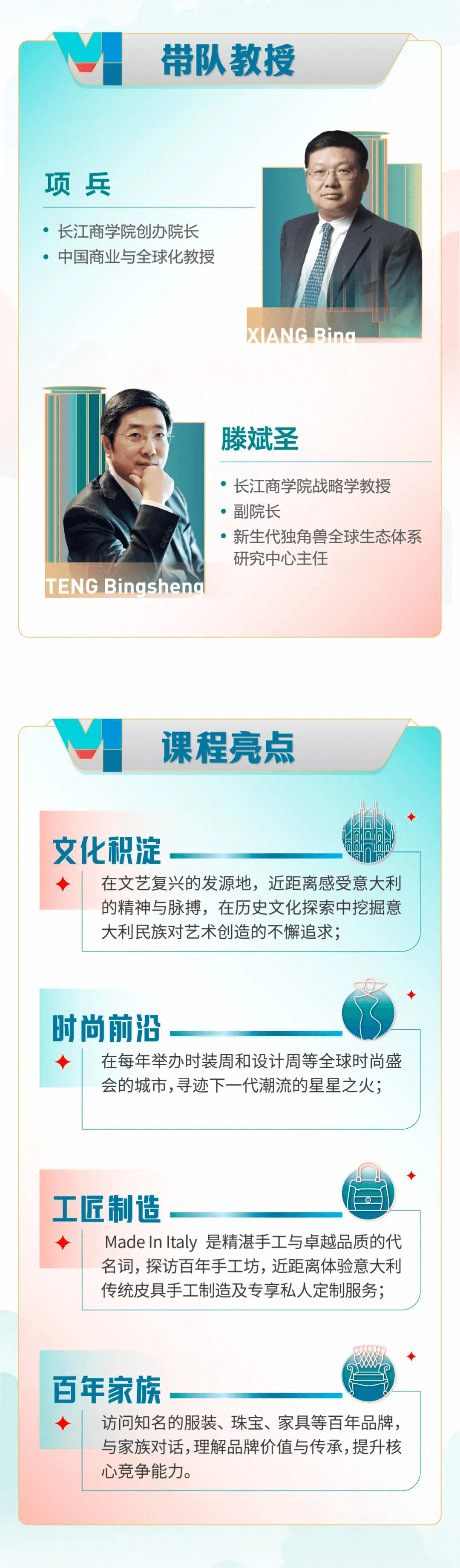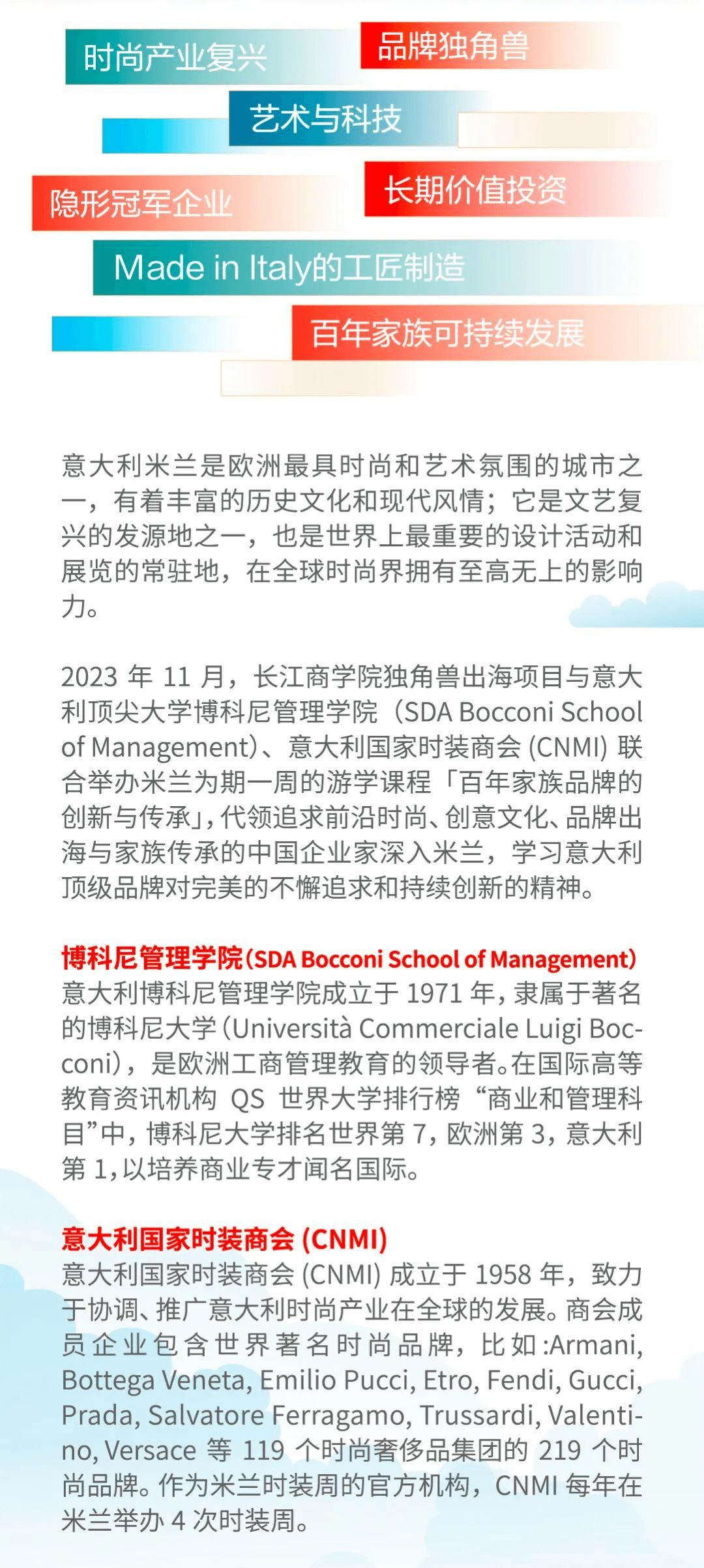 11月,長(zhǎng)江商學(xué)院【獨(dú)角獸出海】項(xiàng)目-意大利米蘭站即將啟程,我們將在項(xiàng)兵院長(zhǎng)和滕斌圣教授的帶領(lǐng)下,與意大利首府院校【Bocconi大學(xué)】開展課程合作,徜徉在意大利首府院校的課堂學(xué)習(xí);走進(jìn)百年企業(yè)和國(guó)際品牌,與家族成員交流、論道經(jīng)營(yíng)管理、洞察新機(jī)遇。