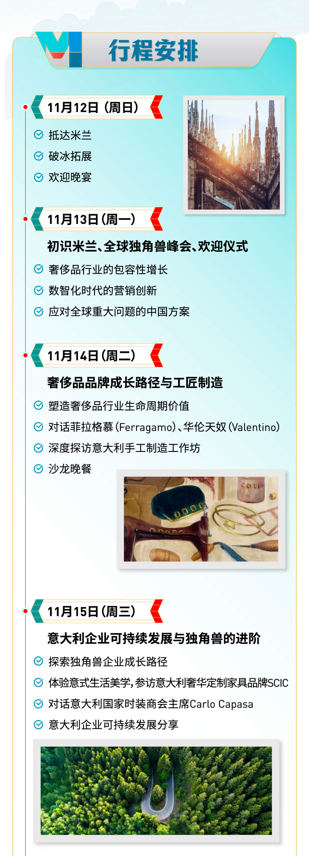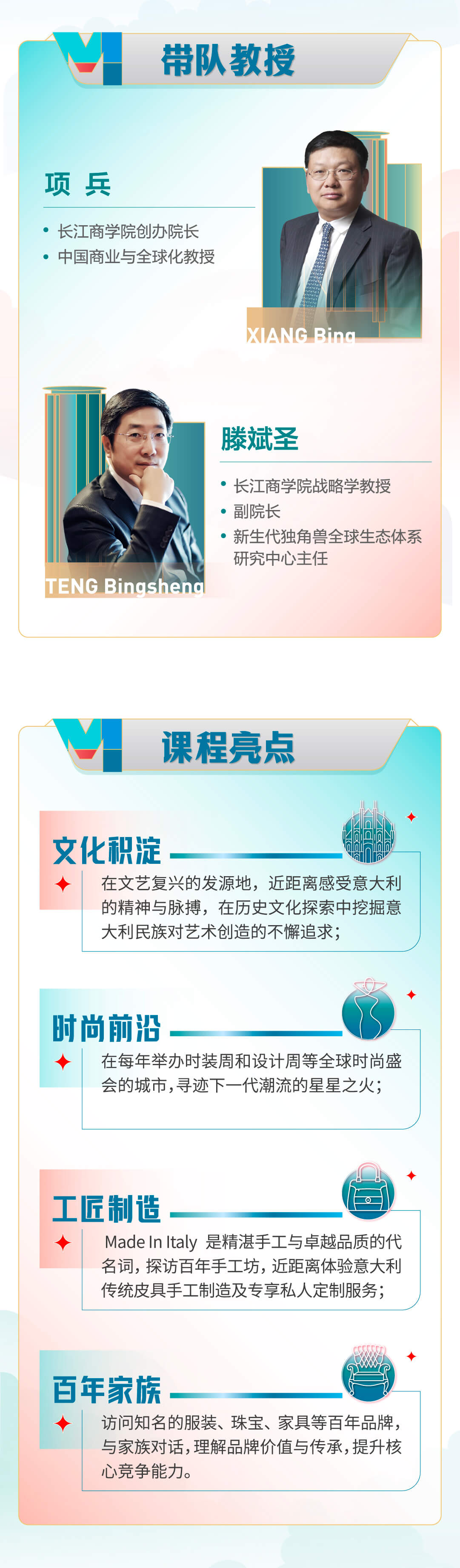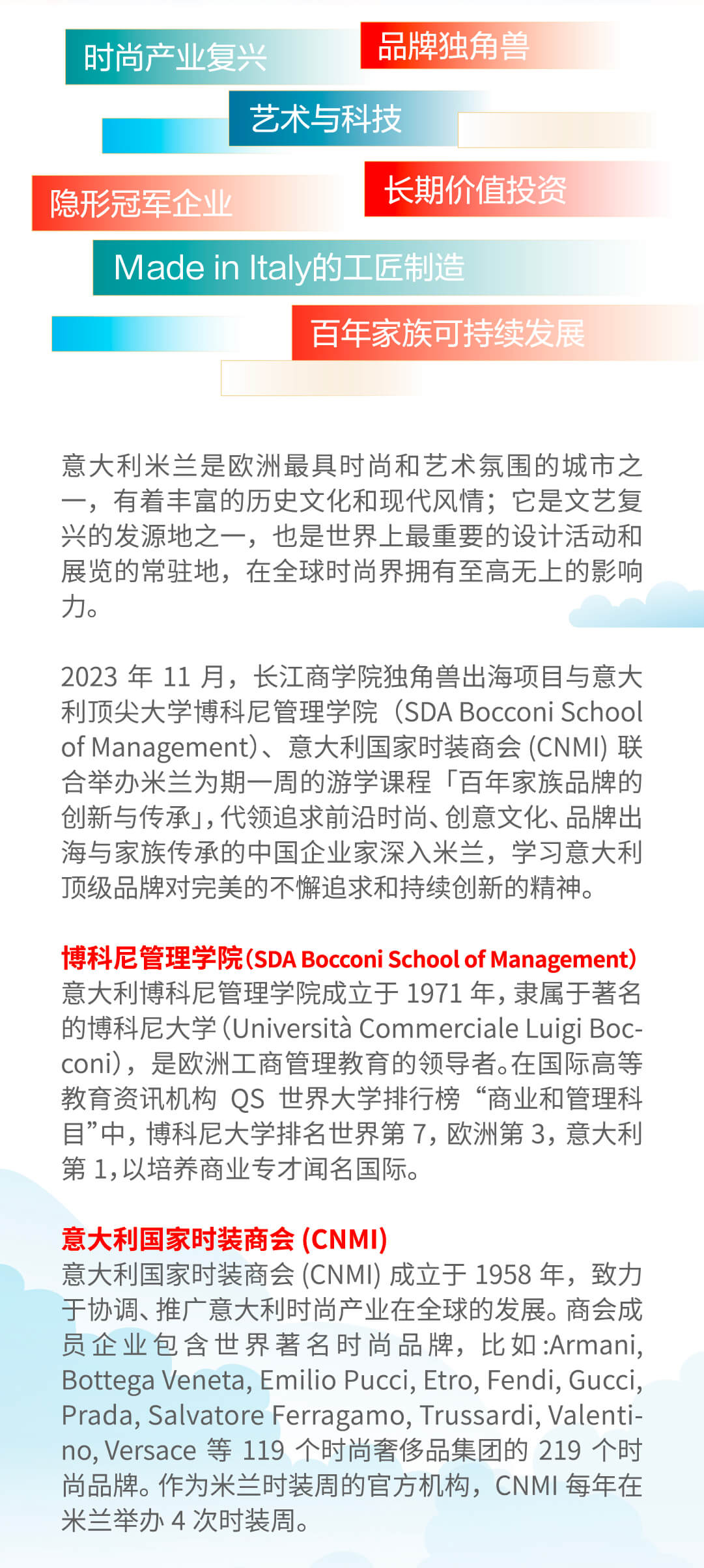 11月,長江商學院【獨角獸出海】項目-意大利米蘭站即將啟程,我們將在項兵院長和滕斌圣教授的帶領下,與意大利首府院校【Bocconi大學】和【意大利國家時裝協會CNMI】開展課程合作,徜徉在意大利首府院校的課堂學習、走進百年企業和國際品牌,與家族成員交流、論道經營管理、洞察新機遇。