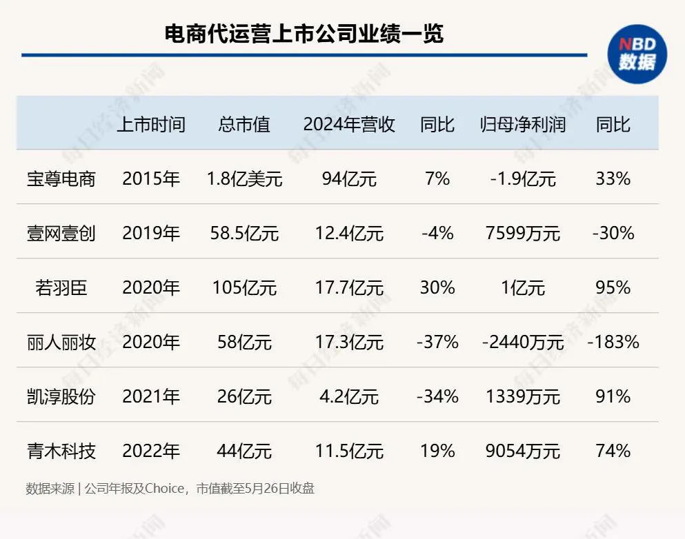 隨著中國成為全球美妝行業第二大市場,以美妝業務為主的幾家代運營公司先后上市,風頭正勁,其股價、市值均處于歷史高峰,寶尊電商(09991.HK,股價7.9港元,市值15億港元)和麗人麗妝(605136.SH,股價14.9元,市值59.67億元)市值均一度超過200億元,而以代理母嬰和保健品為主的若羽臣彼時顯得默默無聞。