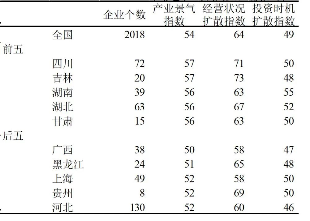 ● 地区景气指数排名前五的省份为:四川、吉林、湖南、湖北、甘肃;