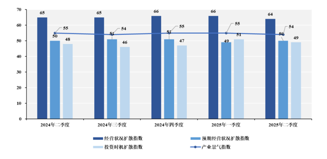 2025年第二季度,经营状况扩散指数为64,较上一季度的66小幅回落2点,但仍稳居荣枯线上方,显示企业当期经营整体保持韧性。