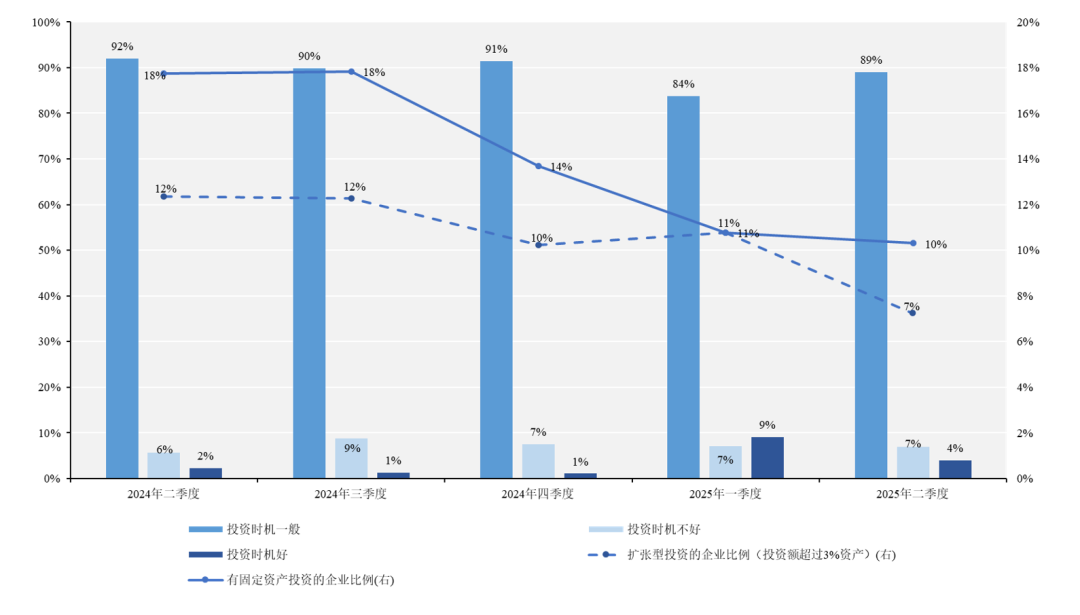 ● 扩张型投资的企业比例从 11% 下降至 7%,显示企业在资本开支上的动作更加保守。