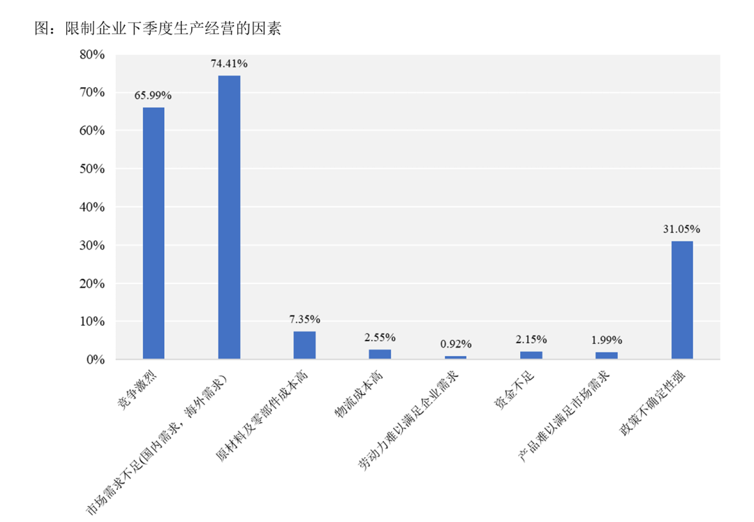 注:该问题为多选题,基于各选项被选择的次数作图(以竞争激烈65.99%为例,2018家受访企业中有65.99%的企业认为竞争激烈是限制其下季度生产经营的因素之一)。
