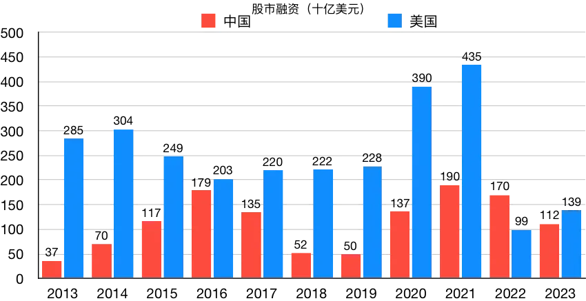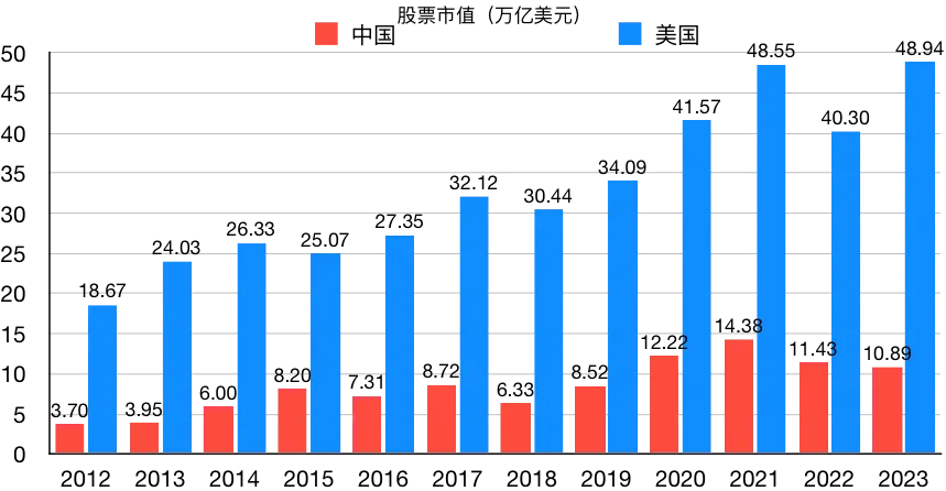 在股权融资方面,美国公司更多地通过发行股票进行融资,包括公开发行股票(IPO)、再融资(SPO)等。中国也在逐渐增加股权融资的比重,但相对于美国仍较为有限。图表11是2012年至2023年中国和美国股票市值对比。中国股票市场规模远小于美国。中国股票市值(上交所+深交所)远小于美国股票市值(纽交所+NYSE)。2023年底,中国股票市值10.89万亿美元,是美国股票市值(48.94万亿美元)的22%。