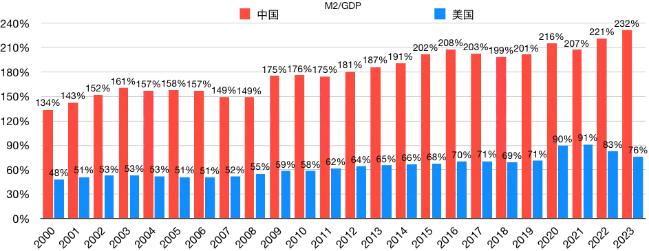 图表5是2000年至2023年中国和美国M2/GDP对比。M2与GDP的比值反映了经济体的货币化程度。中国M2与GDP的比值一直大幅高于美国。在2023年,中国M2/GDP达到232%,大约是美国(76%)的3倍。