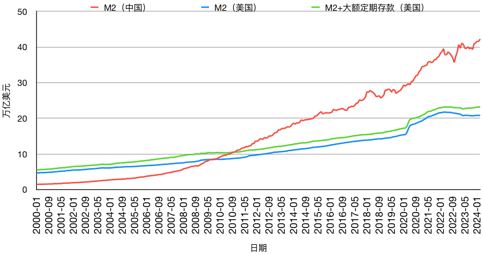 图表3是2000年初至2024年2月中国和美国M2规模对比。与中国M2不同之处是美国M2不包括大额(即10万美元以上)企业定期存款。2009年9月,中国M2规模超过美国M2;2010年11月,中国M2规模超过美国M2加大额定期存款的规模。2024年3月份,中国和美国M2规模分别为42.21万亿美元和20.84万亿美元,中国M2是美国的两倍。