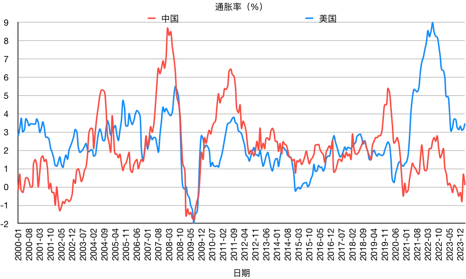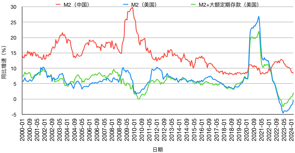 图表4:2000年1月至2024年2月年中国和美国M2同比增速对比
