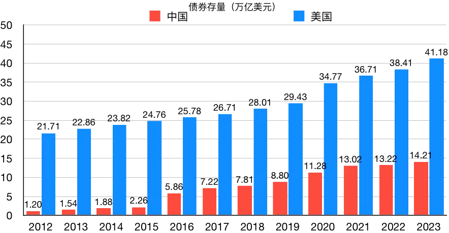 中国和美国在债务市场的发展程度和债务类型上存在差异。美国的债券市场规模庞大,政府和公司可以通过发行政府债、公司债等多种类型的债券进行融资。中国的债券市场相对较新,在政府债券和企业债券发行上还在不断发展。图表10是2012年至2023年中国和美国债券存量对比。中国债券市场规模远小于美国。中国政府债券和企业债券存量规模远小于美国债券市场规模(国债、公司债、市政债)。2023年底,中国债券规模14.21万亿美元,约为美国债券市场规模(41.18万亿美元)的1/3。