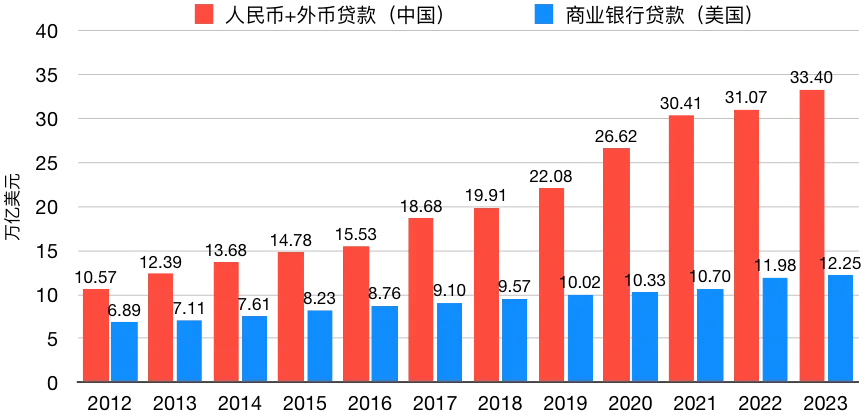 图表8:2012-2023年中国人民币与外币贷款规模和美国商业银行贷款规模对比