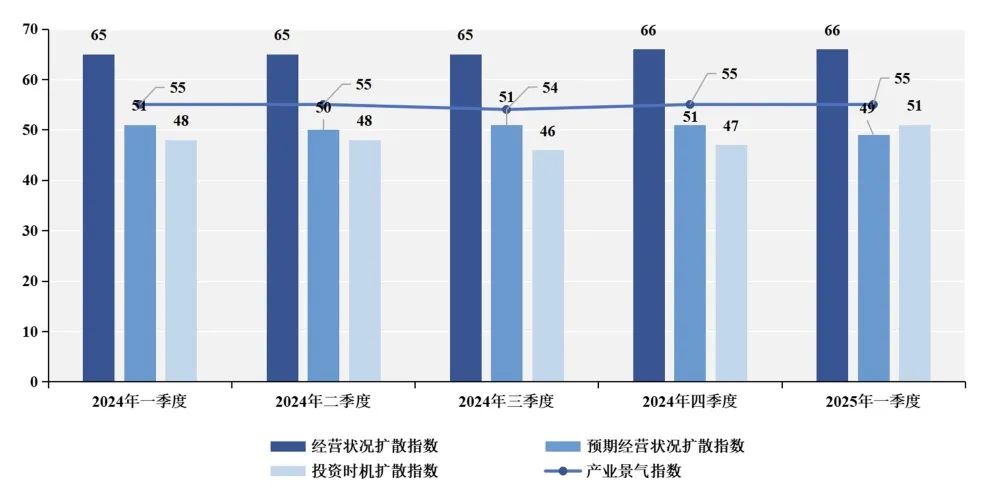 2025年第一季度,经营状况扩散指数维持在66,较上季度持平,继续位于荣枯线上方。
