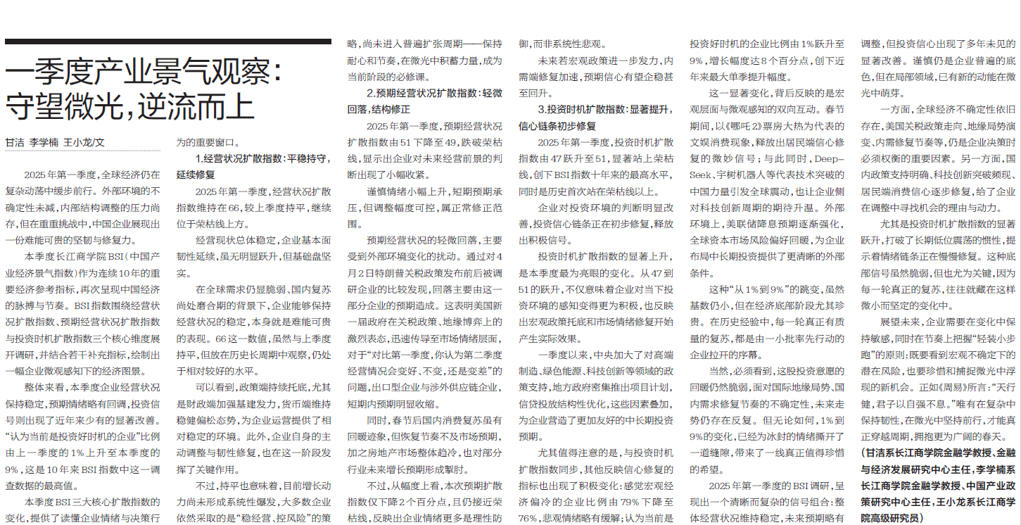 2025年第一季度的BSI调研,呈现出一个清晰而复杂的信号组合:整体经营状况维持稳定,未来预期略有调整,但投资信心出现了多年未见的显著改善。谨慎仍是企业普遍的底色,但在局部领域,已有新的动能在微光中萌芽。